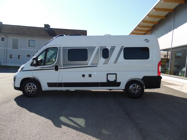 Carado CV600 Pro+ Edition MJ26 mit Variobad mit Heckquerbett auf Fiat Ducato 2,2l 140PS, Automatik, Optik Paket 1 (Stoßfänger lackiert, Skid Plate glänzend schwarz, Nebelscheinwerfer), 90l Dieseltank, DAB Antenne integriert im Außenspiegel, Vorbereitung Dieselheizung, Abwassertank isoliert und beheizt, Holzrost in Dusche, digitales Bedienteil für Combi Heizung, Combiheizung Dieselheizung, Digital Paket CV (Rückfahrkamera mit Parklinien, automatische Fahrerhausklimaanlage, induktives Smartphone Ladefunktion, 10“ Radio Navigation, digitale Instrumentenanzeige), Chassisfarbe weiß, Rahmenfenster, Beklebung Carado alternativ, Schriftzug Pro+, Markise 3,75m, Chassis Paket (elektrische Feststellbremse, elektrisch beheizbare und anklappbare Außenspiegel, Einparkhilfe, Toter Winkelassistent), Co Driver Paket (Regen- und Lichtsensor, Co-Driver Paket inkl ACC mit Stop & Go, Fahrspurzentrierung, Stauassistent, automatisches Bremssystem mit Fußgängererkennung, Spurhalteassistent, Verkehrszeichenerkennung, Fahrermüdigkeitserkennung, intelligenter Geschwindigkeitsassistent), Optik Paket 2 (Lederlenkrad und Schaltknauf in Leder, Luftauslässe silber Techno Trimm, 16“ Alufelgen), Faltverdunkelung Fahrerhaus, Basic Paket (Dachhaube Midi Heki 70 x 50 über Sitzgruppe, Duschausstattung, Fenster im Bad, Kleiderstange in Nasszelle, breite Einstiegsstufe, Drehplatte für Tischerweiterung an der Sitzgruppe), LED Beleuchtung über den Dachstauschränken, Panoramafenster über Fahrer- und Beifahrersitz, Heckdachstauschrank umlaufend, Möbel Visby Oak, Wohnwelt grau fabriksneu Ausstellungswagen