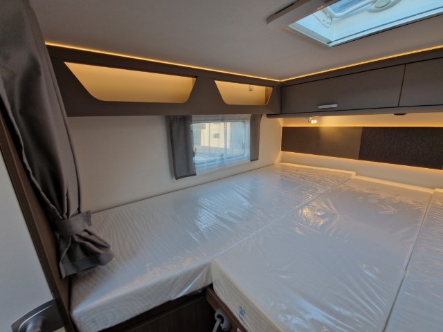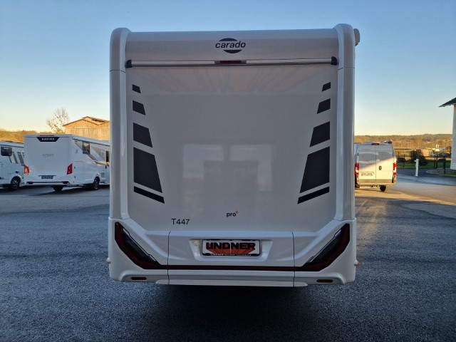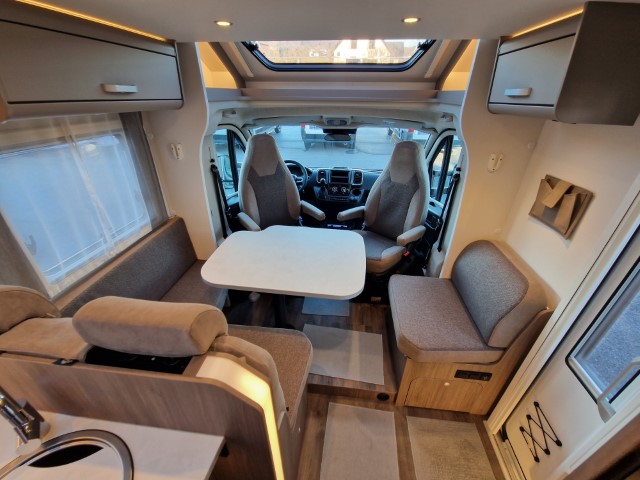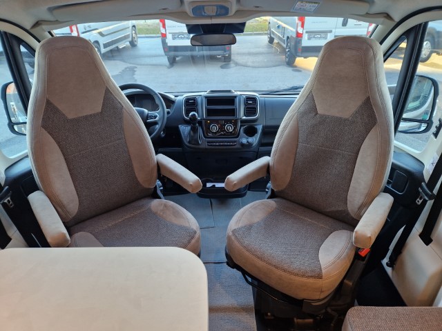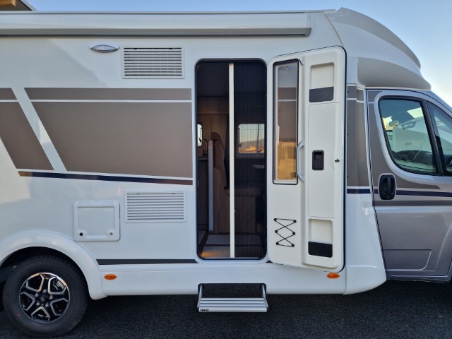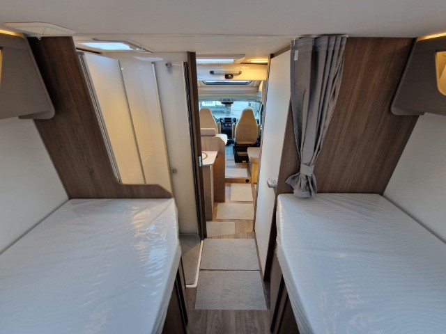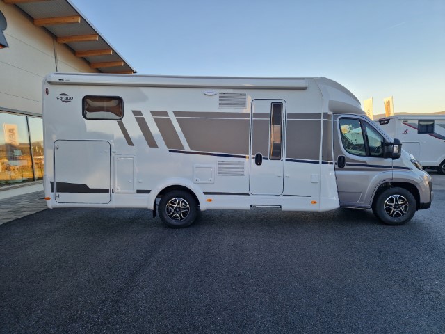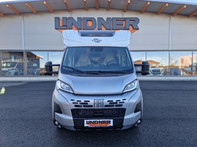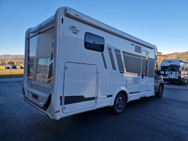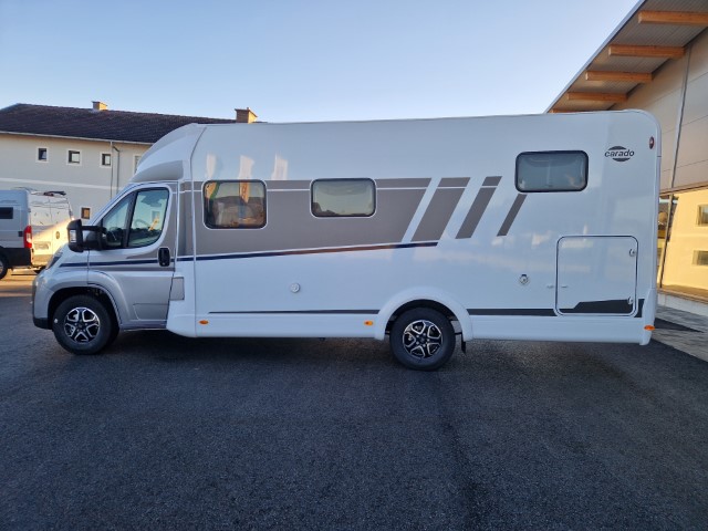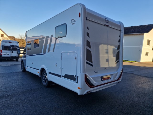 Carado T447 mit Einzelbetten und Garage Pro+ Paket auf Fiat Ducato 140PS, 3,5to, Automatik, Optik Paket 1 (Stoßfänger lackiert, Skid Plate schwarz glänzend, Nebelscheinwerfer), Optikpaket 2 (Lederlenkrad und Schaltknauf in Leder, Armaturentafel mit Apllikationen Techno Trim, 16“ Alufelgen), Basicpaket (Panoramadachhaube 70 x 50 cm, Klarglasdachhaube 40 x 40 cm, Fliegengittertür, Komforteingangstür mit Fenster und Verdunkelung, Bridge Light), Chassisaußenfarbe artense grau metallic, Design Applikation Heck, Fenster in Fronthaube, Rahmenfenster, 2. Außenstauraumklappe, Beklebung Carado alternativ, Abwassertank isoliert, Schriftzug Pro+, Markise 4,5m weiß, Faltverdunkelung Fahrerhaus, großer Kühlschrank 156l mit seperatem Frosterfach 29l, Safety Paket inkl ACC (adaptiver Tempomat, automatisches Bremssystem mit Fußgängererkennung, Regen- und Lichtsensor, Spurhalteassistent, Verkehrszeichenerkennung, Fahrermüdigkeitserkennung, intelligenter Geschwindigkeitsassistent), 90l Dieseltank, Bettenbau Einzelbett zu Doppelbett, Hubbett, Holzrost in Dusche, Heizung Combi 6EH, Stoff braun, Möbel Visby Oak fabriksneu Ausstellungswagen